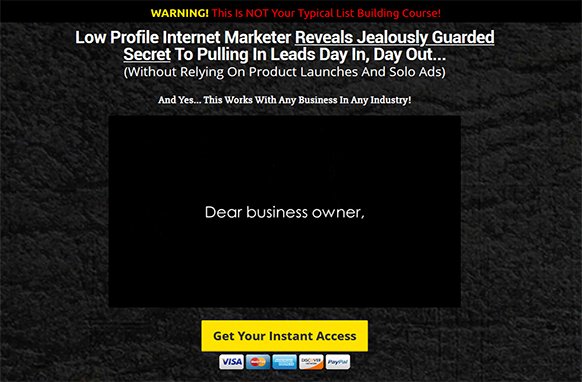 This Is NOT Your Typical List Building Course! Low Profile Internet Marketer Reveals Jealously Guarded Secret To Pulling In Leads Day In, Day Out... (Without Relying On Product Launches And Solo Ads) And Yes... This Works With Any Business In Any Industry!